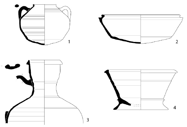 De igual modo, no castelo de Paderne assinalam-se, por exemplo, panelas com asas adjacentes ao colo (Fig. 10, n.º 1) ou caçoilas com depressão para receber tampa (Fig. 10, n.º 2), que são formas frequentes durante o século XIII, mas que se prolongam ao longo da centúria seguinte. Outras formas tipicamente islâmicas, como o alguidar trípode (Fig. 10, n.º 4) ou os grandes cântaros (Fig. 10, n.º 3), continuam a ser comuns durante o século XIV, mantendo os perfis dos seus antecessores almóadas.