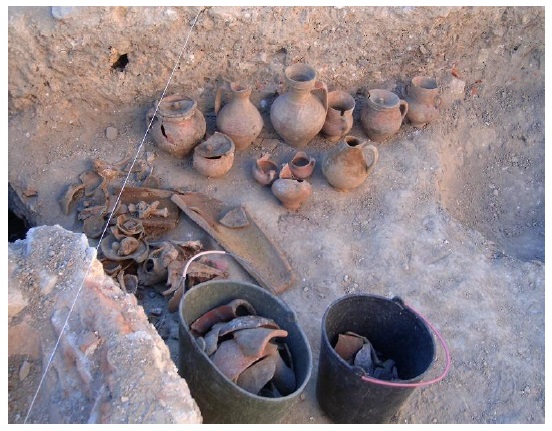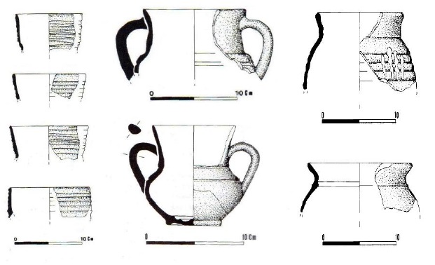 Fig. 8 Um espaço, duas tradições: jarros de colo estriado versus jarras de dupla asa e panelas pintadas a branco. Palmela, finais do século XII/século XIII.
