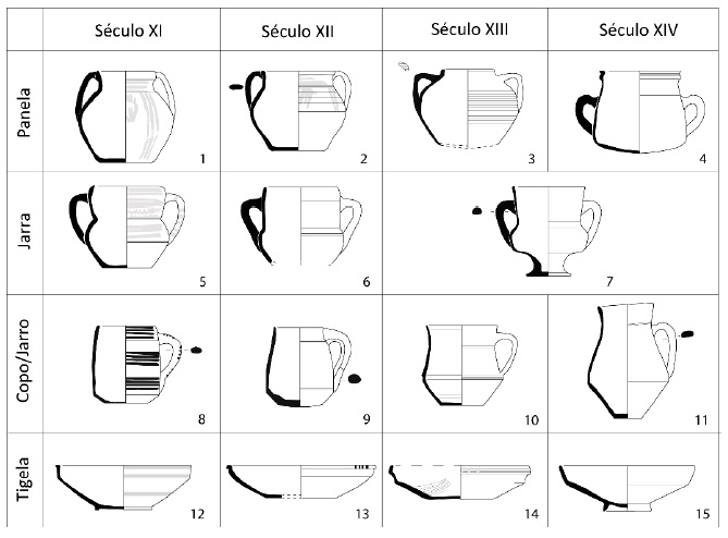 Fig. 4 Evolução de algumas formas cerâmicas registadas em Lisboa (8: Praça Nova, Castelo de São Jorge, Lisboa43; 10: São Vicente de Fora, Lisboa44; 14: Rua Rodrigues de Freitas, Almada45; restantes: Núcleo Arqueológico da Rua dos Correeiros, Lisboa46).