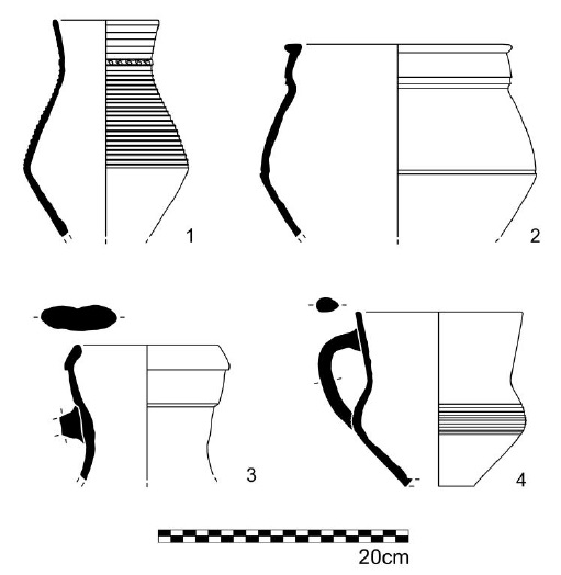 Nas panelas, mantém-se uma grande diversidade formal, com quase todas as variantes assinaladas a corresponderem a uma clara “herança” anterior, que se detecta em pelo menos três perfis diferentes. No primeiro caso, assinalam-se recipientes com corpo globular e marcado estrangulamento no colo, apresentando bordos triangulares, ligeiramente extrovertidos (Fig. 2, n.º 4). Já o segundo tipo corresponde a bordos com lábio de perfil semicircular ou boleado, também extrovertido. Menos comum é a ocorrência de uma variante com bordos ligeiramente extrovertidos, muito moldurados e o lábio afilado. Estas três morfologias estavam já presentes nos conjuntos almorávidas da cidade25.