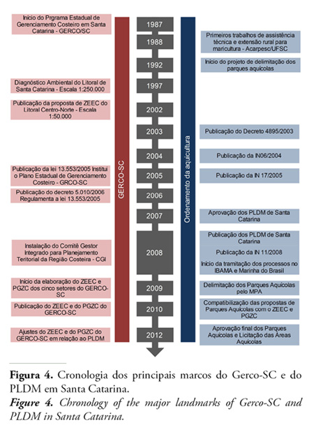 A cronologia de um processo de gestão focando uma política pública constitui-se em um interessante instrumento para o seu entendimento. Alguns marcos na gestão costeira e aquícola de Santa Catarina foram fundamentais para entender a realidade atual (Figura 4). Apesar de terem iniciado praticamente ao mesmo tempo, não há registros de uma integração significativa de ações ao longo do período considerado. Segundo o Gerco-SC, o Programa Estadual de Gerenciamento Costeiro teve início em 1987, um ano antes das primeiras ações documentadas de assistência técnica e extensão rural voltadas para o cultivo de moluscos marinhos (Oliveira Neto, 2005). Esse fato indica que as primeiras iniciativas de gestão costeira e maricultura foram contemporâneas, porém com objetivos diferentes, sendo a primeira de natureza técnica, legal e institucional, e a segunda caracteristicamente produtiva. Apesar das diferenças, para que se estabelecessem como política pública ou atividade econômica foram necessários estudos específicos sobre a zona costeira catarinense.