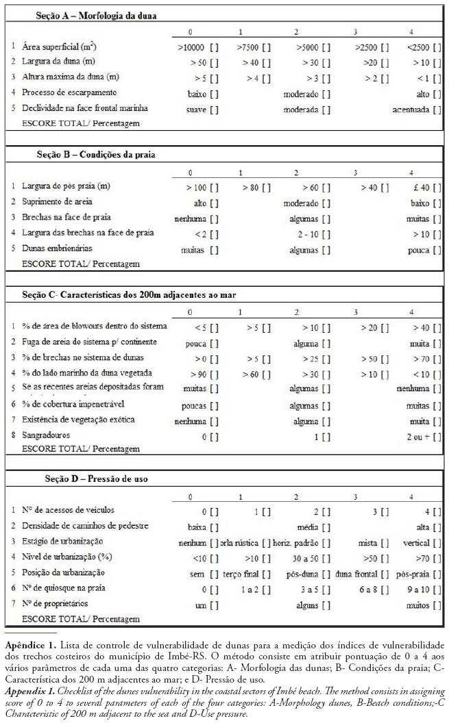 A lista de controle de vulnerabilidade (Apêndice 1) foi estruturada de modo a permitir considerações sistemáticas dos principais parâmetros que resumem as condições das dunas. O método consiste em atribuir pontuação de 0 a 4 aos vários parâmetros de cada uma das seguintes categorias: A- Morfologia das dunas (5 parâmetros); B- Condições da praia (5 parâmetros); C- Característica dos 200 m adjacentes ao mar (8 parâmetros); D- Pressão de uso (7 parâmetros).