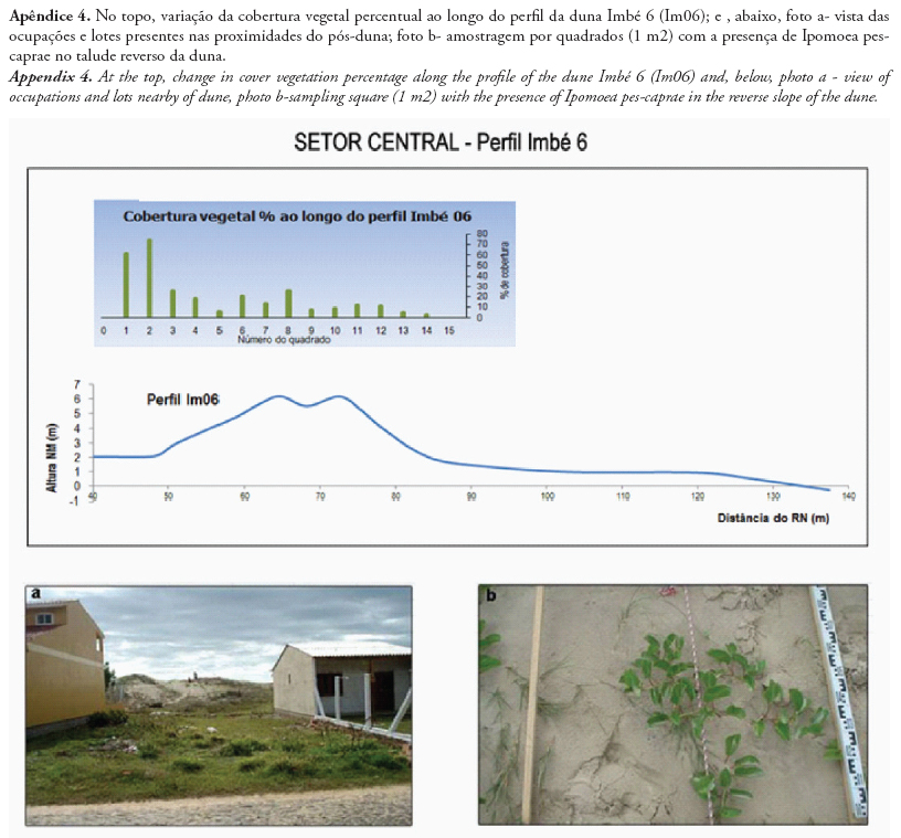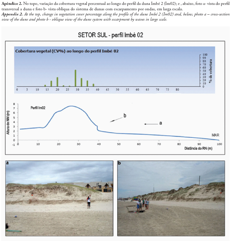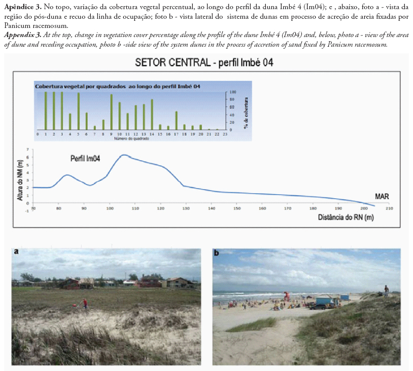 O comprimento do campo de dunas frontais condiz com o modelo de urbanização sobre a APP. De modo geral, observa-se uma pressão maior sobre as dunas situadas nos loteamentos imobiliários mais antigos (Balneários do litoral Centro-Norte de Imbé). O mais longo perfil de duna preservada é o perfil 3, que se correlaciona ao empreendimento Condomínio Las Olas, enquadrado nas normas mais recentes de licenciamento. As quatro figuras anexas são representativas das condições morfoecológicas das dunas setorizadas em Sul (Apêndice 2), Central (Apêndice 3 e 4) e Norte (Apêndice 5).