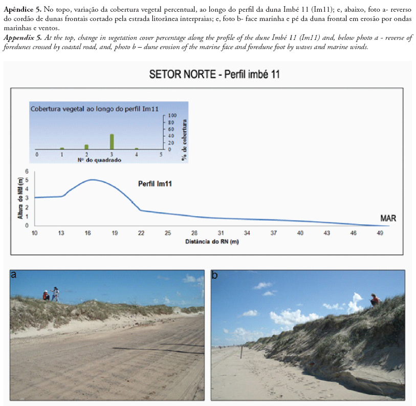 Em direção ao norte, ao contrário, ocorre a diminuição dessas variáveis morfométricas e aumento da declividade da face marinha da duna e dos processos de escarpamento por ondas de tempestades (perfis 9, 10 e 11). Os taludes marinhos das dunas dos Setores Centro e Norte estão em fases diferentes de preenchimento e recuperação da vegetação, muitos dos quais desenvolvendo novo cordão de duna no pós-praia, em ciclo de recuperação pós-tempestade (perfil 7).