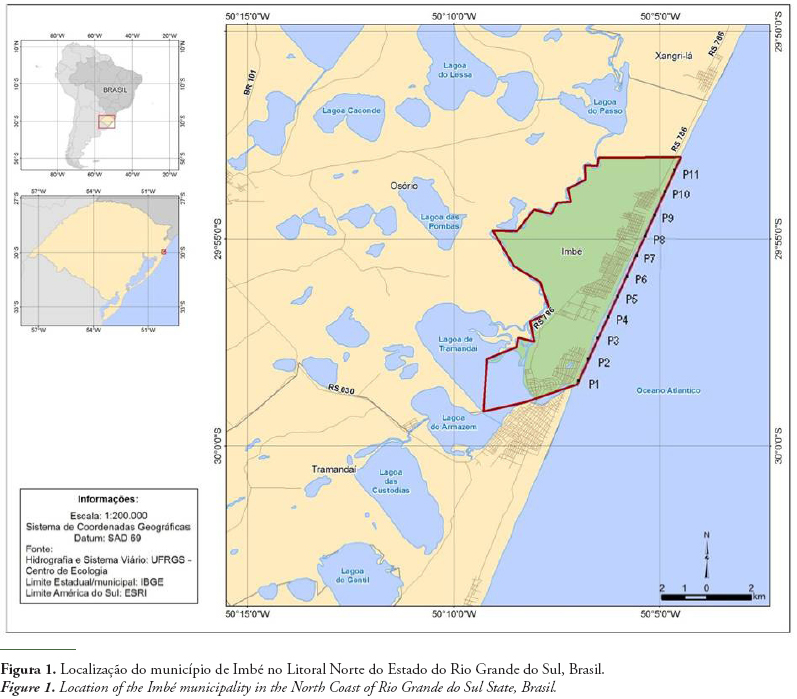 O litoral do município de Imbé faz parte da porção nordeste do litoral Norte do Rio Grande do Sul (Fig. 1), e está inserido no sistema deposicional Barreira-Laguna IV formado durante o estágio final da transgressão marinha pós-glacial (Dillenburg et al., 2000). Na borda leste desta barreira, situam-se as praias oceânicas atuais, a partir das quais, para o interior, desenvolvem-se extensos campos de dunas.