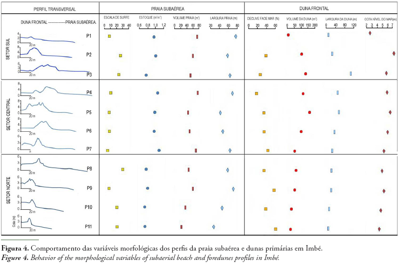 As formas erosivas exibem bacias de deflação pouco vegetadas, de moderada a alta escala espacial, e escarpas na face marinha produzidas por ondas de tempestades, cuja inclinação (≥30%) apresenta diferentes fases de entalhe e preenchimento (Setor Norte). Numa situação de colapso do sistema eólico ocorrem muitas brechas e descontinuidades laterais do cordão de dunas. Uma duna com morfologia estável e bem vegetada apresenta a inclinação da face marinha suave (≤ 30%) e levemente convexa, resultando em maior estabilidade frente aos fortes ventos (Setor Central). A presença de dunas incipientes no pós-praia caracteriza a duna em acreção (perfil 4), que além de proteger a base da duna estabilizada, indica a recuperação ou progradação do sistema em direção ao mar.