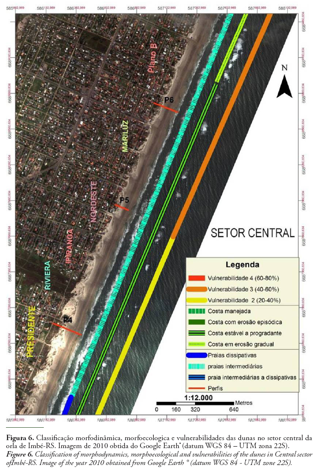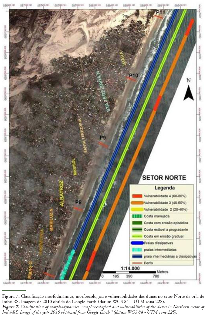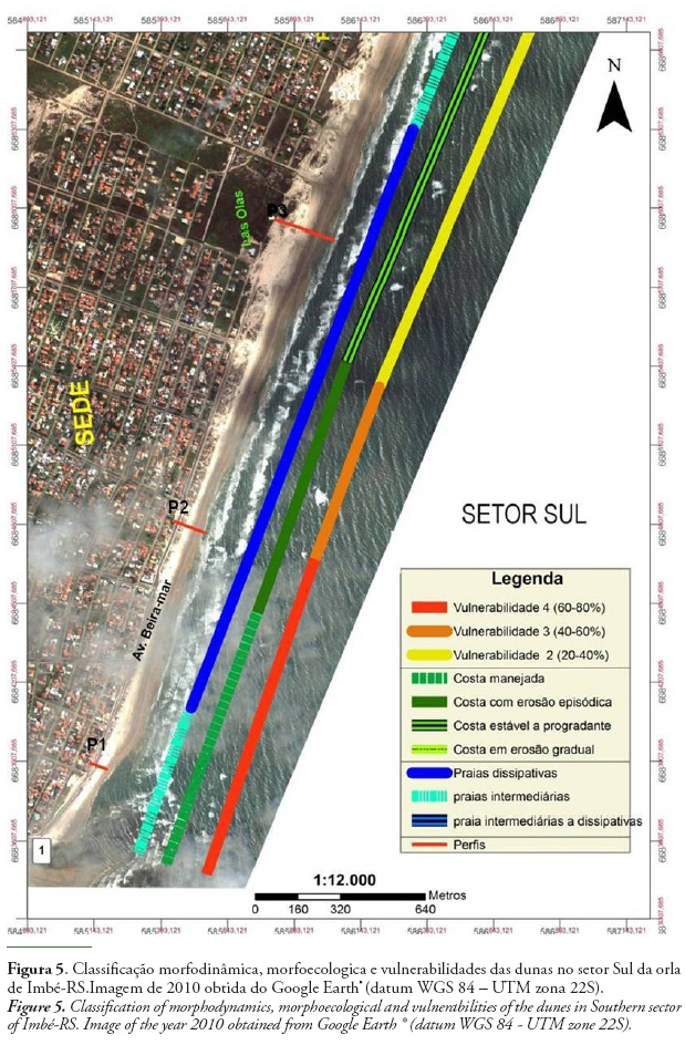 The north coast of the state of Rio Grande do Sul (Brazil) has been suffering a continuing process of human occupation in the last decades due to the expansion of tourism and second-residences.The need of the municipality of Imbé (Rio Grande do Sul – RS) to elaborate the Plan of Dune Management led to the construction of a method for managing coastal assessment to priority sectors. The diagnosis is a first step to the planning of the whole coast of the municipality, which uses criteria of environmental analysis and human occupation, seeking the division into sectors. The identification of conflicts between urbanization and beach facilitates the choice of management techniques and control the different use of space, in order to solve the problems of erosion and the littoral degradation. Between december 2011 and march 2012 classical techniques of beach morphodynamic, morphology and ecology of the dunes were applied in the research area. Also, they were complemented with an data matrix elaborated from environmental and urbanization patterns (checklist) for setting rates vulnerabilities (IV%). Four sectors with similar characteristics were identified to facilitating the application of management techniques in a large spacial scale: South sector (a) – urbanized coast without dunes; South sector (b) – erosional coast due wave and washouts; Central sector – progradational and stable coast; North sector – gradual erosional coast. At the north of beach, the risk of erosion and degradation of foredunes grew up due to the expansion of urban and the construction of the road on APP (Area of Permanently Protection) dunes. Coincidently decreased the subaerial beaches and losses of stock sediment into the transgressive dunefield of Imara. As suggestions to control the erosion problem, the Plan of Dune Management of the Imbé beach proposes: Installing sand fences, scattering the dead vegetation, constructing foredunes and vegetation plantings, resizing the washouts, improving the beach access and signalizations in addition to environmental education.