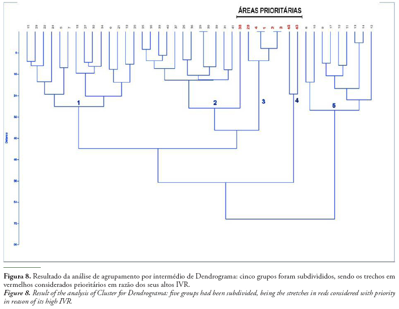 Após a construção de uma matriz definida pelo escore dos 25 parâmetros em função das 43 unidades amostrais, as variáveis foram normalizadas entre 0 a 4, e aplicada à análise multivariada com auxílio do pacote estatístico PAST (Hammer et al., 2001). Grupos de unidades amostrais homogêneas em relação às variáveis tratadas estatisticamente foram separados pela análise de agrupamento (Dal Cin & Simeoni, 1994). Os setores prioritários ao manejo contêm os maiores índices de vulnerabilidade e, geralmente, se agrupam em uma única categoria estatística por causa do comportamento similar das variáveis analisadas (Tabajara et al., 2005).