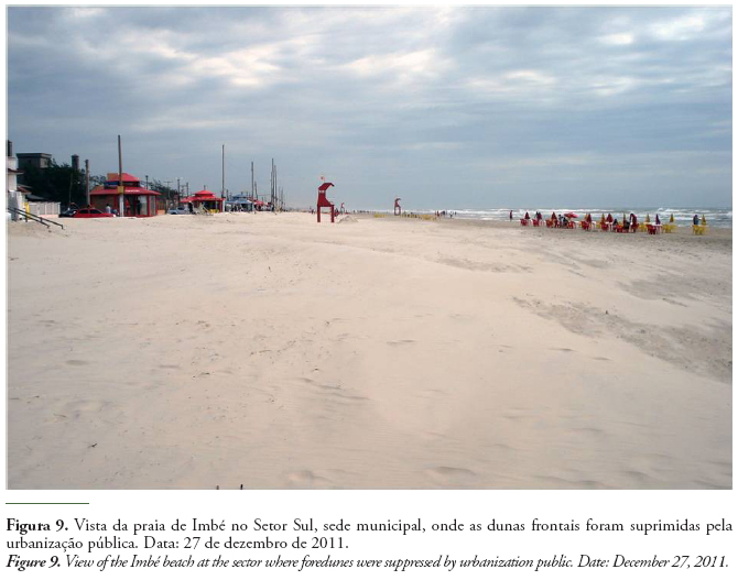 Variações pontuais extremas (IVR ≥60%) foram observadas nas unidades amostrais Imbé 28, 38 e 43. Entre os balneários Mariluz e Harmonia (Imbé 28), a ocupação dos lotes está totalmente no interior da APP das dunas, a largura da duna frontal se reduz a menos de 10 m e a entrada de veículos se faz pela praia. O trecho Imbé 38 situa-se no Balneário de Imara e caracteriza um segmento com intensa ocupação de moradias de baixa renda sobre as dunas frontais. No extremo norte do município (Imbé 43), a duna frontal vem sendo degradada, tanto por máquinas na manutenção da RS-786 (estrada interpraias) como por ondas, que a reduzem a forma de um dique.