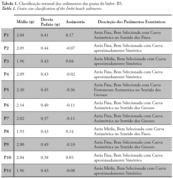 O estudo verificou uma condição sinóptica do litoral de Imbé, reinante no início do verão, que geralmente exibe estado morfodinâmico intermediário de energia moderada (Toldo Jr. et al., 1993). A Figura 4 apresenta o comportamento morfométrico das praias subaéreas de Imbé, inferido dos nivelamentos topográficos transversais à praia. A Tabela 1 mostra a classificação textural dos sedimentos coletados na zona do estirâncio das praias oceânicas de Imbé, em dezembro de 2011. Em uma abordagem mais genérica, a variação espacial no tipo de praia ao longo da costa possibilitou a sua subdivisão em três setores: Sul, Central e Norte.