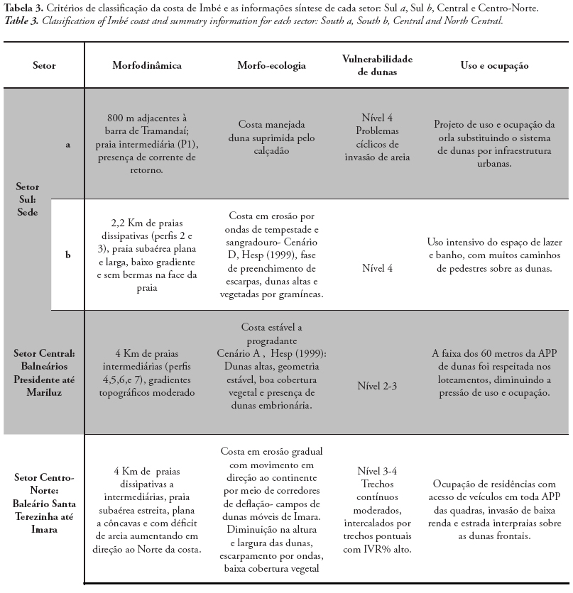 A classificação dos setores da costa, segundo o limiar de resiliência das dunas, identificou três grandes classes de índices de vulnerabilidade, enquadrada nas categorias 2, 3 e 4 (Tab. 2). Na categoria 4 (60-80%) situam-se os trechos de maior vulnerabilidade e que necessitam de planos de recuperação ambiental e manejo.