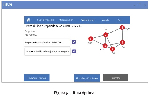 Partiendo de la importación del análisis de las dependencias entre áreas de proceso y la trazabilidad de los objetivos de negocio con respecto a CMMI, se realiza una comparación generando la ruta que es más efectiva para dar inicio a la implementación de mejoras de procesos de software como puede visualizarse en la Figura 5.