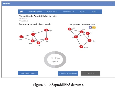 La funcionalidad de adaptabilidad de rutas, permite que el usuario pueda realizar ajuste a la propuesta que la herramienta ha generado con base a su análisis. Y con ello se realiza una comparación entre la propuesta y la personalizada, dando como resultado el porcentaje de esfuerzo que implica realizar la mejora de procesos con respecto a la propuesta de la herramienta.