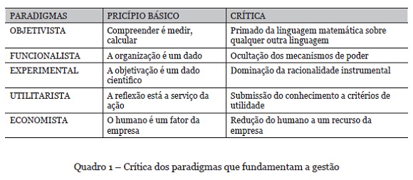 Para entender os principais paradigmas existentes nos manuais de gestão, (Gaulejac, 2015), apresenta as razões pelas quais eles não são pertinentes para compreender o mundo da empresa e das organizações, conforme o quadro abaixo: