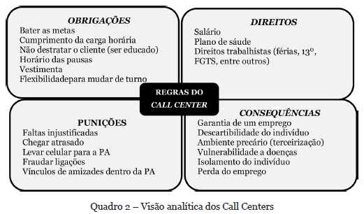 As regras no Call Center, conforme Almeida & Benevides (2018) são distribuídas em quatro aspectos, que são: obrigações, direitos, punições e consequências. Esses aspectos não se equilibram em relação aos impactos que causam sobre os trabalhadores.