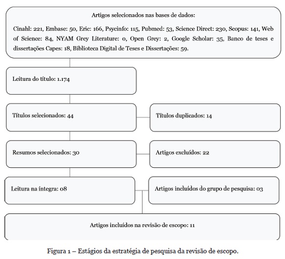 Na segunda etapa, houve a definição dos descritores, expandindo a busca para as bases de dados Cinahl, Embase, Eric, Pubmed, Science Direct e Web of Science.