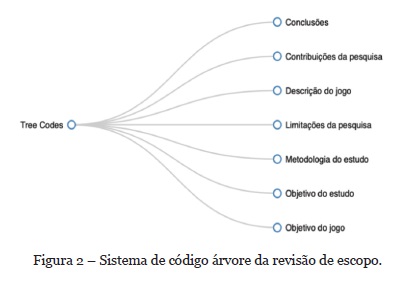 Este instrumento foi incorporado ao software de análise qualitativa webQDA (Costa, Moreira, & Souza, 2019). Os artigos na íntegra foram inseridos como fontes internas, classificados conforme o ano de publicação, o país, o idioma, a área do conhecimento, o desenho metodológico, a concepção de jogo, o tipo de jogo, o público alvo, a categoria de abordagem da violência e os tipos de violência. Também foram codificados de acordo com as categorias empíricas: objetivo do estudo, metodologia do estudo, contribuições da pesquisa, limitações da pesquisa, objetivo do jogo, descrição do jogo e conclusões. Para tanto, as autoras utilizaram o sistema de código árvore (Figura 2).