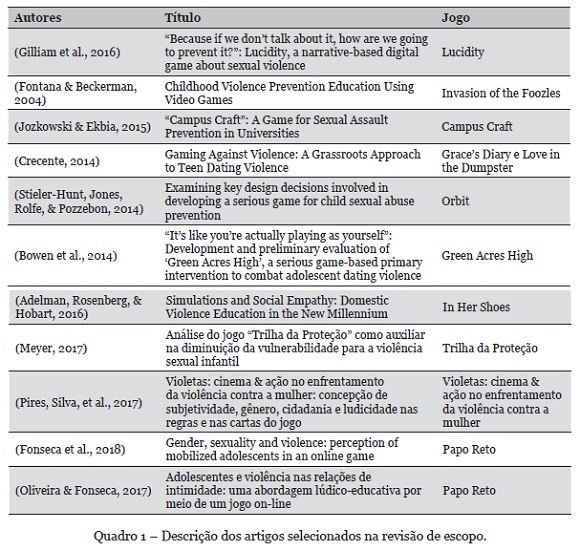 Destaca-se que alguns artigos, relacionados à produção de jogos educativos para abordagem da violência de gênero, elaborados pelo grupo de pesquisa Gênero, Saúde e Enfermagem da Escola de Enfermagem da Universidade de São Paulo, do qual fazem parte as autoras do estudo, foram incluídos na revisão, uma vez que não foram encontrados nas bases de dados consultadas, por terem relevância para a produção científica brasileira sobre a temática.