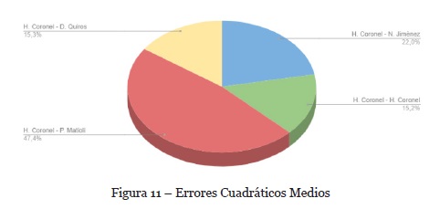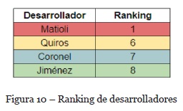 Se observa en la Figura 10 las posiciones de los desarrolladores analizados que dio la recomendación de la tarea POC-66, basada en el criterio de orden obtenido. En la Figura 11 se puede observar el cálculo del ECM entre las métricas reales obtenidas de la ejecución de la tarea POC-66 realizada por Coronel y las métricas estimadas para D. Quiros, N. Jiménez, H. Coronel y P. Matioli. Como se esperaba, se puede observar que el ECM entre las métricas estimadas y reales de Coronel es el mínimo de los 4 presentados.