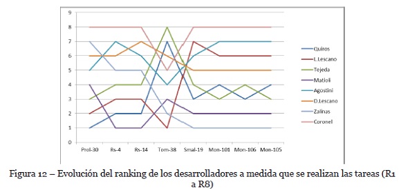 En la Figura 13 se pueden visualizar cuáles fueron las posiciones en el ranking para cada uno de los desarrolladores a lo largo de las recomendaciones de las distintas tareas (R1 a R8).