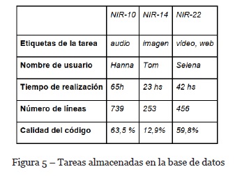 Una tarea será similar a la tarea aún no asignada, si tienen en común un cierto número de etiquetas entre sus descripciones y/o si sus habilidades coinciden con un cierto número de las habilidades ingresadas como deseadas para la tarea. En nuestro ejemplo en la tarea NIR-24 las etiquetas son web y audio. El histórico de tareas de la organización almacenada hasta el momento en la base de datos se puede observar en la Figura 5. El algoritmo devolverá como tareas similares a NIR-10 y NIR-22, dado que al menos una de sus etiquetas coincide con las etiquetas de NIR-24.