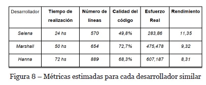 En el caso de estudio las métricas estimadas para la tarea NIR-24 para cada uno de los desarrolladores similares se muestran en la Figura 7. Para el cálculo de las mismas el algoritmo utilizó el valor de la métrica tiempo de realización que ingresó el líder del proyecto en el asistente. Si el líder de proyecto hubiese ingresado valores de otras métricas que deseaba para la tarea, se tendría que haber usado el indicador de similitud mencionado anteriormente, para obtener el mejor conjunto de métricas estimadas para cada desarrollador similar.