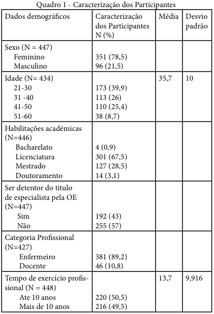 Os dados foram obtidos com a aplicação de um questionário online, com a colaboração da Ordem dos Enfermeiros Portugueses (OE), ao qual responderam 448 enfermeiros.