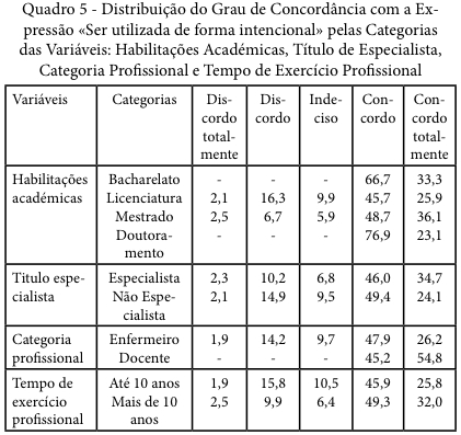 Porque se destacam pela menor concordância obtida, procedeu-se ao cruzamento da concordância dos enfermeiros quanto à expressão "ser utilizada de forma intencional" e "possuir valor clinico autónomo de outras intervenções", com as variáveis de caraterização. Verifica-se, de acordo com o quadro nº 5, que a concordância com a afirmação "ser utilizado de forma intencional", é maior para os inquiridos com mais de 10 anos de experiência profissional, especialistas em enfermagem pela OE e docentes. Quanto ao grau académico verifica-se que todos os bacharéis concordam, sendo importante ter em conta a baixa percentagem de respondentes neste grupo e, em relação aos outros graus, o nível de concordância aumenta nos graus mais elevados, sendo que todos os doutores concordam.