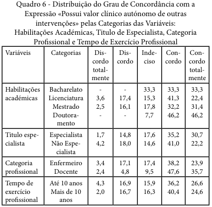 Quanto à concordância dos inquiridos com a expressão "possui valor clínico autónomo de outras intervenções", e pela análise do quadro nº 6, verifica-se que esta é maior para os doutores, para os que têm o título de especialista pela OE, para os docentes e para os que têm mais de 10 anos de exercício profissional.