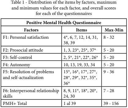 In the same direction, the Positive Mental Health (PMH) construct, first put forward by Jahoda (1958), emerged as a means to explore and define that “something more than the absence of illness” which, from the beginning of the twentieth century formed a part of the standard definition of mental health. In order to put the concept of PMH into operation, Lluch (1999) put forward a questionnaire and a multifactor model that may be explained on the basis of six inter-related factors: Personal Satisfaction (F1), Prosocial Attitude (F2), Self-control (F3), Autonomy (F4), Resolution of Problems and Self-actualization (F5), and Interpersonal Relationship Skills (F6). Both, the model and the questionnaire (Lluch,1999) have been examined in the context of research projects and doctoral theses, in nursing as well as in other related areas of science, with attention placed on exploring the relations between Positive Mental Health (PMH) and the ability for self-care, emotional intelligence, healthy lifestyles, physical health, and mental illness (Lluch-Canut, Puig-Llobet, Sánchez-Ortega, Roldán-Merino, Ferré-Grau & Positive Mental Health Research Group, 2013). The questionnaire has also been translated into Portuguese (Sequeira, Carvalho, Sampaio, Sá, Lluch-Canut & Roldán-Merino, 2014). The results of the various investigations lend support to the definition of PMH as a dynamic, fluctuating construct that includes thoughts and feelings, both positive and negative. It is, after all, as healthy to be worried when in situations of uncertainty as it is to feel happy when things are going well (Lluch, 2008). The balance among factors showed lowered levels of the ability to resolve problems to be offset on occasion by a heightened level of personal satisfaction.