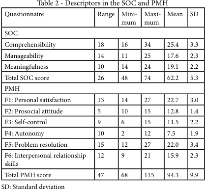RESULTS: Overall, the sample studied scored high in the Sense of Coherence and the Positive Mental Health questionnaires. In terms of the relation between the overall scores of the SOC questionnaire and the PMH, analysis revealed a positive relation between the two.