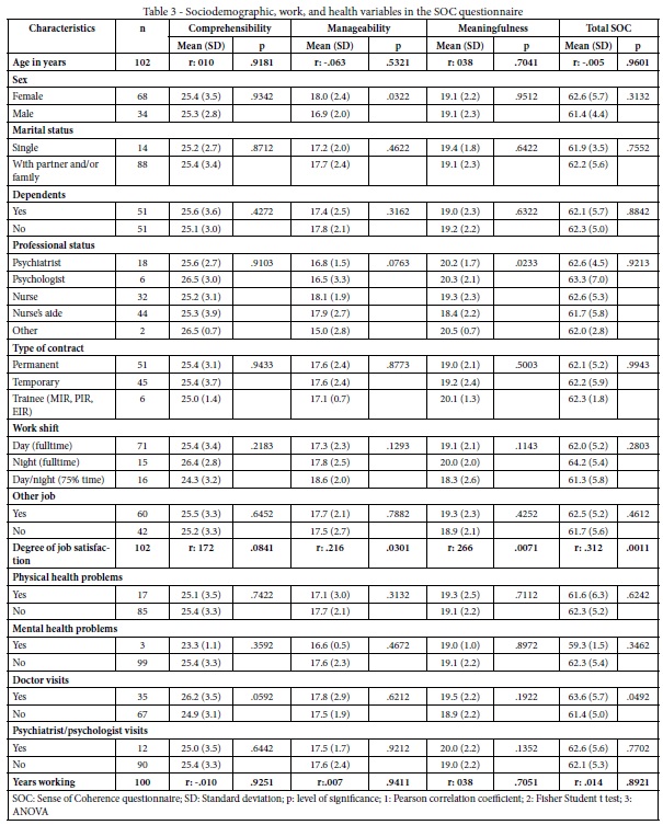 METHODS: The sample was made up of n=102 attending professionals at the mental health units of the Parc Hospitalari Martí i Julià, in Salt, Girona. The variables studied were sociodemographic work-related, health-related, and self-perception of mental health, evaluated by means of the Sense of Coherence questionnaire and the Positive Mental Health questionnaire. The questionnaires were self-administered.