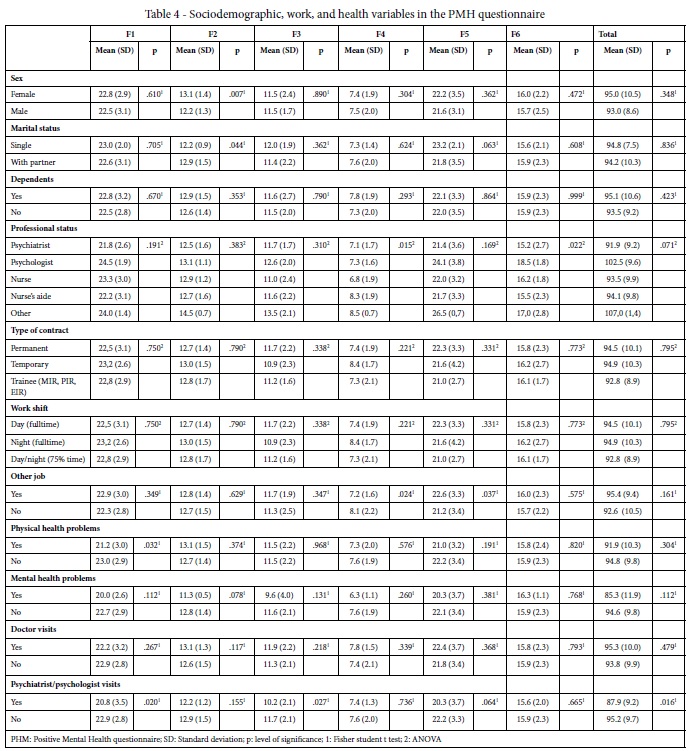 There was observed to be a relation between the age of the professionals and factor F4: Autonomy (p=0.038), with an increase in the individual criteria and independence with increased age. As to the relation between sex and factor F2: Prosocial Attitude, the scoring of the women was higher than that of the men, reaching statistical significance (p=0.007), with an average score of 13.10 points (SD: 1.48). The women also therefore scored higher in terms of a predisposition to ‘altruism’ and helping others. It is of note that the professionals who said that they did not have health problems had statistically significant scores in the factor F1: Personal Satisfaction (p=0.032), related to high self-esteem, satisfaction with their personal life, and an optimistic outlook toward the future. In contrast, those who had needed to see a psychiatrist or psychologist had lower values in terms of factor F3: Self-control (p=0.027) relative to the ability to maintain an emotional balance. No statistically significant differences were found relative to the other variables.