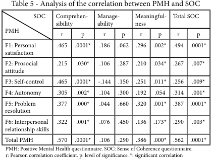 CONCLUSÕES: A relação positiva entre o SOC e a SMP pode ser especialmente interessante para abrir futuras pesquisas relacionadas com o estudo do modelo multifatorial de Saúde Mental Positiva e o modelo salutogênico que sustenta o sentido de coerência, podendo originar um marco concetual global para o estudo da saúde mental a partir de uma perspectiva positiva.