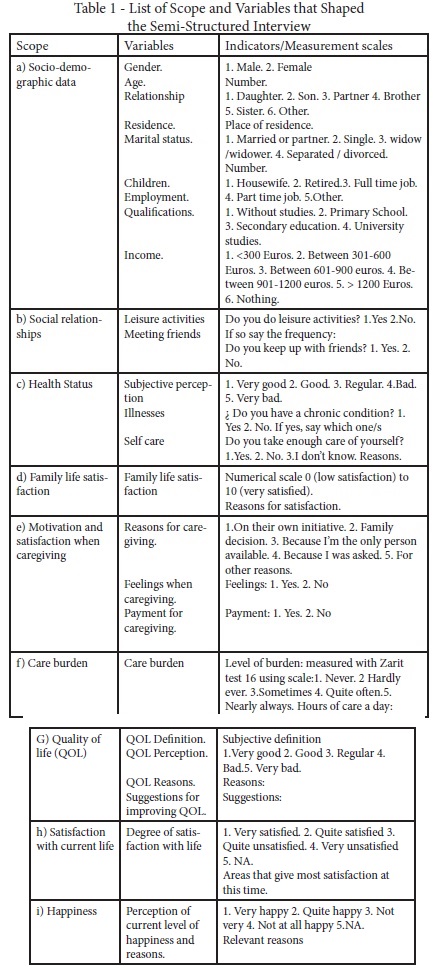 The scope analyzed was: a) socio-demographic data, b) social relations, c) health status of the caregiver, d) satisfaction with regard to family life, e) motivation and feelings about caring, f) care as a burden, g) QOL, h) life satisfaction and i) perception of happiness. The technique chosen was a semi-structured interview conducted by the researcher in the caregiver's home, and recorded with the permission of the interviewee, following a telephone appointment from data provided by the nurses in the home care service. The tool used to conduct the semi-structured interview is shown in Table 1. To elaborate, questions which had been validated by the Sociology Research Center5 and the World Organization Health (OMS, 2000), were taken into account as well as the Zarit test to determine the level of burden in care (Martín et al., 1996). This test has 22 items. The cutoff points are: <46 No burden; 46-47 to 55-56 Slight burden; > 55-56 Extreme burden. This test is used a generic in Primary Care in Catalonia for all caregivers. Burden was assessed with other variables from the interview. A trial run was carried out before interviewing the caregivers of the study.