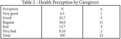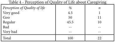 RESULTADOS: Em nosso estudo, metade dos cuidadores tinha uma percepção regular de saúde e qualidade de vida, a carga de cuidados, déficit de autocuidado e sentimentos contraditórios para o cuidado.