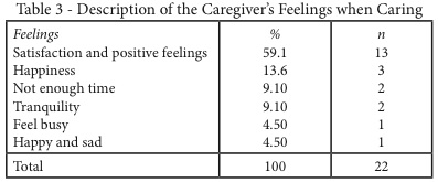 Among the reasons caregivers gave for looking after their elderly, it stands out that the majority care on their own initiative, feel satisfied doing the caring and would feel bad if they didn't do it as for many of them their duty is to look after the people in their family. With regard to identifying whether they received any financial compensation for caring for a dependent elderly person, the results showed that 90.9% (n=20) were not paid for caring. As for the perceived feelings about caring, 81.8% (n=18) had positive feelings when doing care work (Table 3). With regard to determining if care was a burden according to the Zarit test, the maximum score was 37 points, which means that they did not show care to be a burden, as the results were not higher than 46 points (the score at which it is considered a burden). However, they reported having little free time and spending X = 6.9 hours a day looking after the elderly person, means little sleep, little rest and do not make a balanced diet. They also expressed that they didn't look after themselves enough due to a lack of time for their personal lives.
