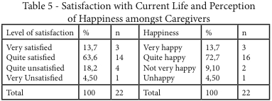 The perception of the quality of life as good or very good was related to being healthy, satisfied and happy about being a caregiver, having good family relationships and geriatric resources. The perception of a fair or poor quality of life was related to poor health, and not having much social relationship. Psychological problems that were expressed and related to a poor or non-existent QOL were anxiety, depression and stress. With regard to determining the degree of life satisfaction, 77.2% (n=17) were satisfied (see Table 5). Regarding the aspects that gave them most satisfaction at present, aspects relating to the family (having good family relationships and family health) stood out most; other aspects were being the caregiver, having free time, being able to read and study and maintain relationships with friends. Regarding the perception of happiness, 72.7% (n=16) reported feeling quite happy (see Table 5).