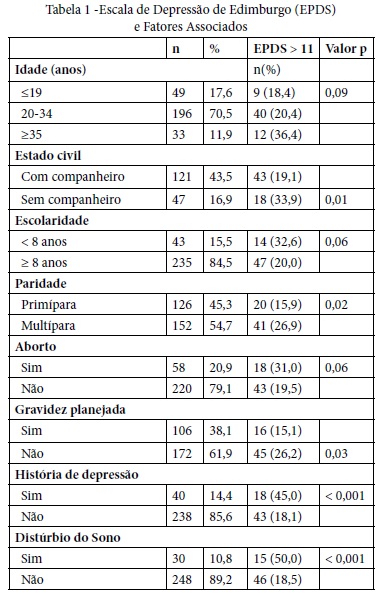 Participaram da pesquisa 278 mulheres no puerpério imediato. Os escores da Escala de Depressão de Edimburgo iguais ou superiores a 11, ponto de corte estabelecido por Santos, Martins & Pasquali (1999), o qual descreve a presença de sintomas depressivos, e os fatores associados podem ser vistos na Tabela 1.