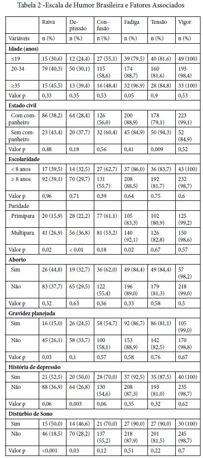 RESULTADOS: Escores ≥11 na EPDS apresentaram-se associados estatisticamente à baixa condição econômica, multiparidade, gravidez não planejada, história de depressão e distúrbio do sono. Em relação à BRAMS, mulheres com renda per capta acima de 300,00 reais apresentaram sentimentos de vigor, entretanto, os sentimentos de raiva, depressão e fadiga, mostraram-se associados à multiparidade, gravidez não planejada, história de depressão e distúrbio do sono.