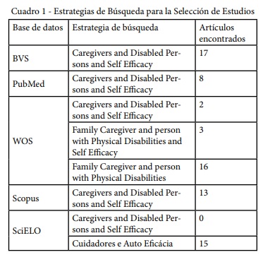 METODOLOGÍA: Se utilizó el formato PICO para la pregunta de investigación. Se buscaron artículos científicos en las bases de datos Scopus, PubMed, SciELO, BVS y WOS, teniendo en cuenta los descriptores: autoeficacia, cuidadores y personas con discapacidad, con sus respectivas traducciones al inglés y portugués. Se establecieron cuatro estrategias de búsqueda diferentes utilizando el booleano AND. Los filtros aplicados fueron: texto completo y límite de temporalidad 2008 a 2018.