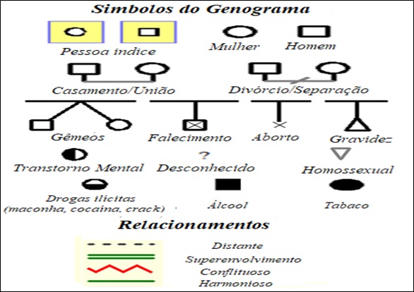 O modelo gráfico utilizado para construção do genograma foi adaptado de Mcgoldrick, et al., (2012). Para caracterização do relacionamento familiar, foram utilizados quatro tipos de representação: 1) relacionamento superenvolvimento: há uma fusão e dependência emocional entre os membros familiares; 2) relacionamento harmonioso: experiência emocional de união entre os membros familiares que nutrem sentimentos positivos e que possuem interesses, atitudes ou valores recíprocos; 3) relacionamento conflituoso: relações nas quais há constantes atritos que geram muita ansiedade e desavenças no meio familiar; e 4) relacionamento distante: caracteriza-se por pouco contato, principalmente de ordem emocional (Leonidas & Santos, 2015).