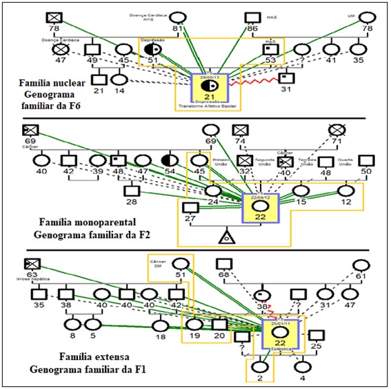Tal característica foi marcante no genograma da Família 12 (Figura 3). Desse modo, os relacionamentos conflituosos, presentes na geração atual, também se faziam presentes no padrão de relacionamento do jovem índice com os demais membros nas duas gerações familiares.