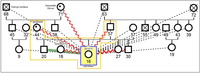 Como antecedentes e fatores disparadores para a TS do jovem, foram encontrados os seguintes marcadores: o uso de drogas de abuso, em 11 genogramas analisados; presença de transtornos mentais, em cinco;- depressão, em quatro; e esquizofrenia, em uma família. Em relação ao jovem índice, foram identificados os seguintes fatores: conflitos de orientação sexual e identidade de gênero, em três casos; e transtornos mentais, em oito - depressão (6), transtorno afetivo bipolar (1) e esquizofrenia (1).
