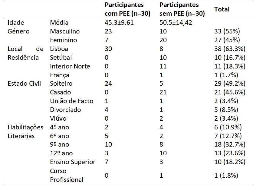 A amostra foi constituída por um total de 60 participantes de ambos os géneros, entre os 24 e os 93 anos (47.9 ± 12.43), dos quais trinta (n=30) tinham o diagnóstico de perturbação do espetro de esquizofrenia (critério de inclusão), com acompanhamento médico em ambulatório. As características sociodemográficas são apresentadas na tabela 1.