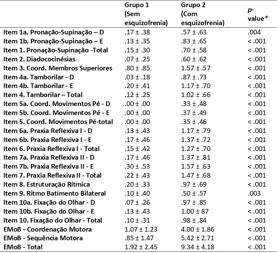 Tal como se observa, os valores obtidos revelam a existência de diferenças significativas entre os dois grupos (com e sem esquizofrenia) em todos os itens, domínios e no total da escala, com os participantes do grupo com esquizofrenia a obter valores médios inferiores, indicadores de desempenhos motores funcionais, ou seja, sem presença de sinais neurológicos motores discretos.
