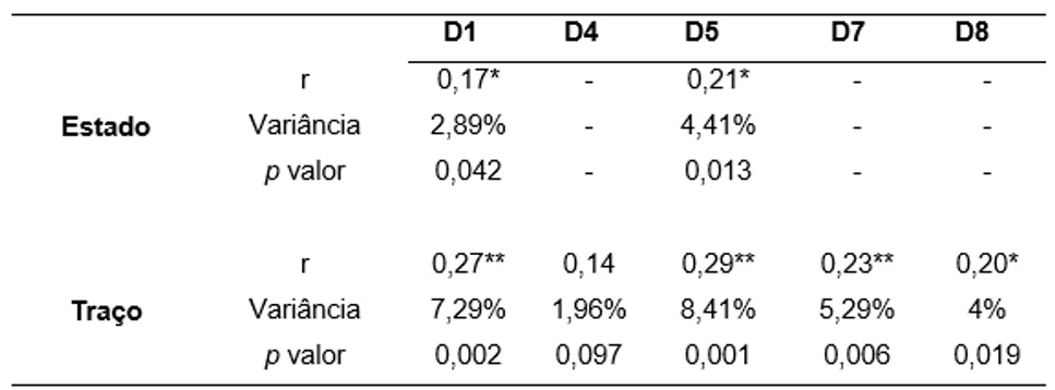 A média de ansiedade enquanto Traço pode ser um preditor da ansiedade enquanto Estado, já que reflete a vulnerabilidade do sujeito ao enfrentamento do cotidiano e manifestação de sintomas de ansiedade. O estado de ansiedade está ligado a situações consideradas como fora da rotina do que o aluno está acostumado, as situações corriqueiras, situações particulares que cada aluno vivencia, até mesmo, a sua entrada em uma universidade o que ocasiona um estado provisório. Em contrapartida, a ansiedade como traço, relaciona-se às características individuais e a forma de encarar os eventos, influenciando negativamente o desempenho acadêmico (Silwal, Gurung, Sah, Koirala e Ojha, 2019; Auerbach, Alonso, Axinn e Cuijpers, 2016).