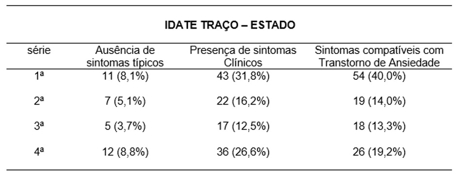 Conforme os dados da Tabela 4, a segunda e terceira série do curso de graduação, destacam-se por apresentarem menores incidências de sintomas compatíveis com transtorno de ansiedade, nas quais a sintomatologia de ansiedade é representada em 14,0% (n=19) na primeira série e 13,3% (n=15) na terceira série no IDATE traço-estado, sendo menos demonstradas frente a determinadas ocasiões pontuais, caracterizando-se que nessas séries, possam existir menos situações consideradas estressoras, ou os alunos realmente conseguem evitá-las.