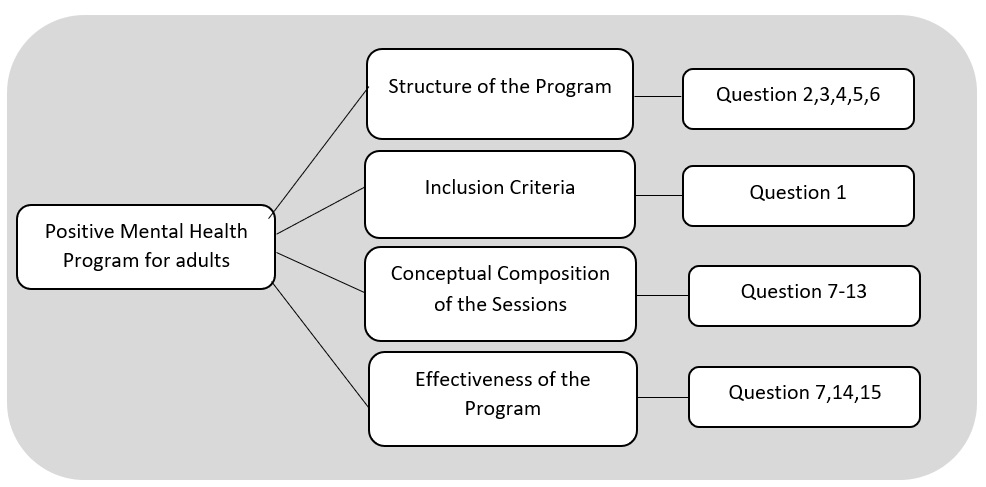 The focus group discussion was based on the following questions, symbolically presented as the “anxieties” in the construction of the program: 1) Did you agree with the following mandatory inclusion criteria for adults in the Positive Mental Health Program? 2) The proposed program lasts at least 7 weeks (1h session per week). Did you agree? 3) 2 initial sessions of 1 hour each will take place. Did you agree? 4) 3 sessions (A, B, C) per factor/dimension will take place, with a duration of at least 1 hour. Did you agree? 5) Can the program work individually or in groups (2 - 12 persons maximum)? 6) The first contact (initial session) with the participants will be individual or in group, depending on the professional context, 1 week to 1 month before the program starts. Did you agree? 7) Did you agree with the objectives of the 1st session (group or individual) and the objectives of the 2nd (individual) correlating with the description of the sessions activities? 8) After application of the Positive Mental Health Questionnaire and detected greater vulnerability in factor F1- Personal Satisfaction will be realized 3 group sessions. Did you agree with the objectives correlating with the description of the session’s activities? 9) After application of Positive Mental Health Questionnaire and detected greater vulnerability in factor F2 - Prosocial Attitude will be realized 3 group sessions. Did you agree with the objectives correlating with the description of the session’s activities? 10) After application of Positive Mental Health Questionnaire and detected greater vulnerability in factor F3 - Self-control will be realized 3 group sessions. Did you agree with the objectives correlating with the description of the session’s activities? 11) After application of Positive Mental Health Questionnaire and detected greater vulnerability in factor F4 - Autonomy will be realized 3 group sessions. Did you agree with the objectives correlating with the description of the session’s activities? 12) After application of Positive Mental Health Questionnaire and detected greater vulnerability in factor F5 - Problem-solving and self-actualization will be realized 3 group sessions. Did you agree with the objectives correlating with the description of the session’s activities? 13) After application of Positive Mental Health Questionnaire and detected greater vulnerability in factor F6 - Interpersonal Relationship Skills will be realized 3 group sessions. Did you agree with the objectives correlating with the description of the session’s activities? 14) Did you agree with the objectives of the final (individual) session and the objectives of the follow-up session (individual) correlating with the description of the sessions’ activities? 15) What would you change in this program? Suggestions.