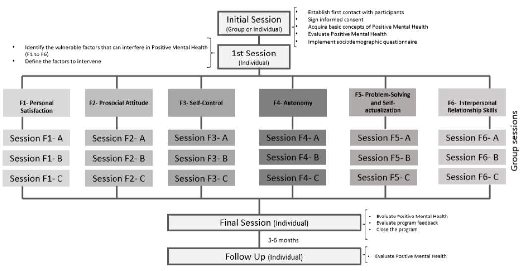 The modules correspond to the “less well” or “vulnerable factors” identified after the application of the Positive Mental Health Questionnaire. From the moment that the Positive Mental Health Questionnaire is applied and interpreted, the groups of individuals that correspond to the same factor/module can be constituted. Thus, a group of 12 persons maximum is determined to carry out the sessions for the factor/module to address. There will be two initial sessions of one hour each. There will be three sessions (A, B, C) for each factor/module, lasting at least one hour. A final session and a follow-up session (3-6 months post-program) will also take place. The program lasts for 7 weeks minimum and 22 weeks maximum (one session per week, of one hour). The duration of the program depends on the individuals participating. It also depends on the number of factors/modules addressed. This is a systematic program. The order of the sessions is regulated by the letters A, B, and C for each factor/module. The final positive mental health program for adults designated Mentis Plus+ is detailed in the Appendix.